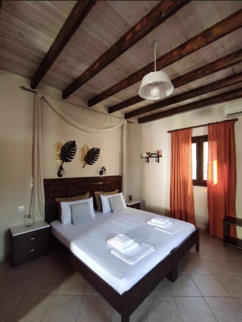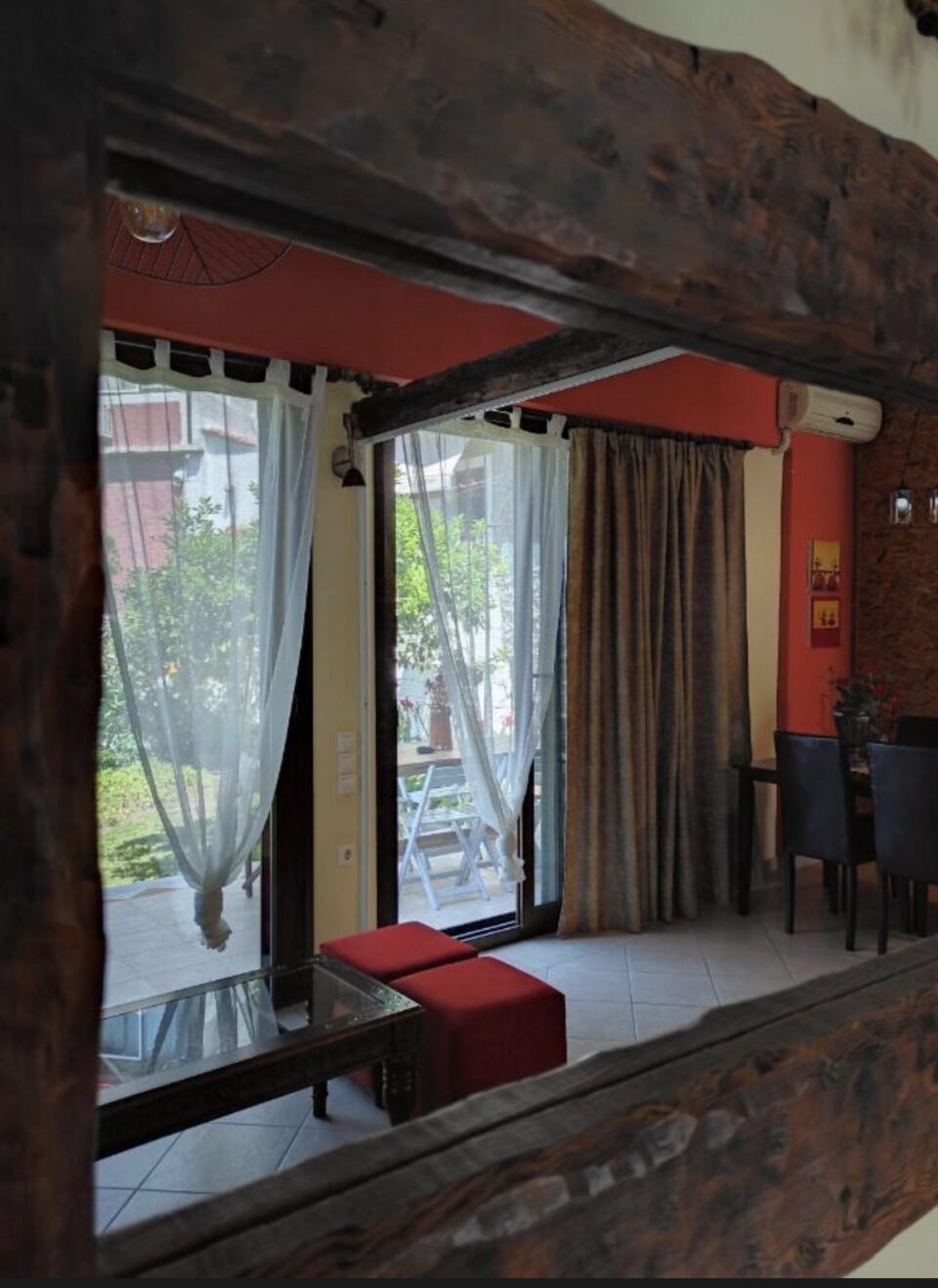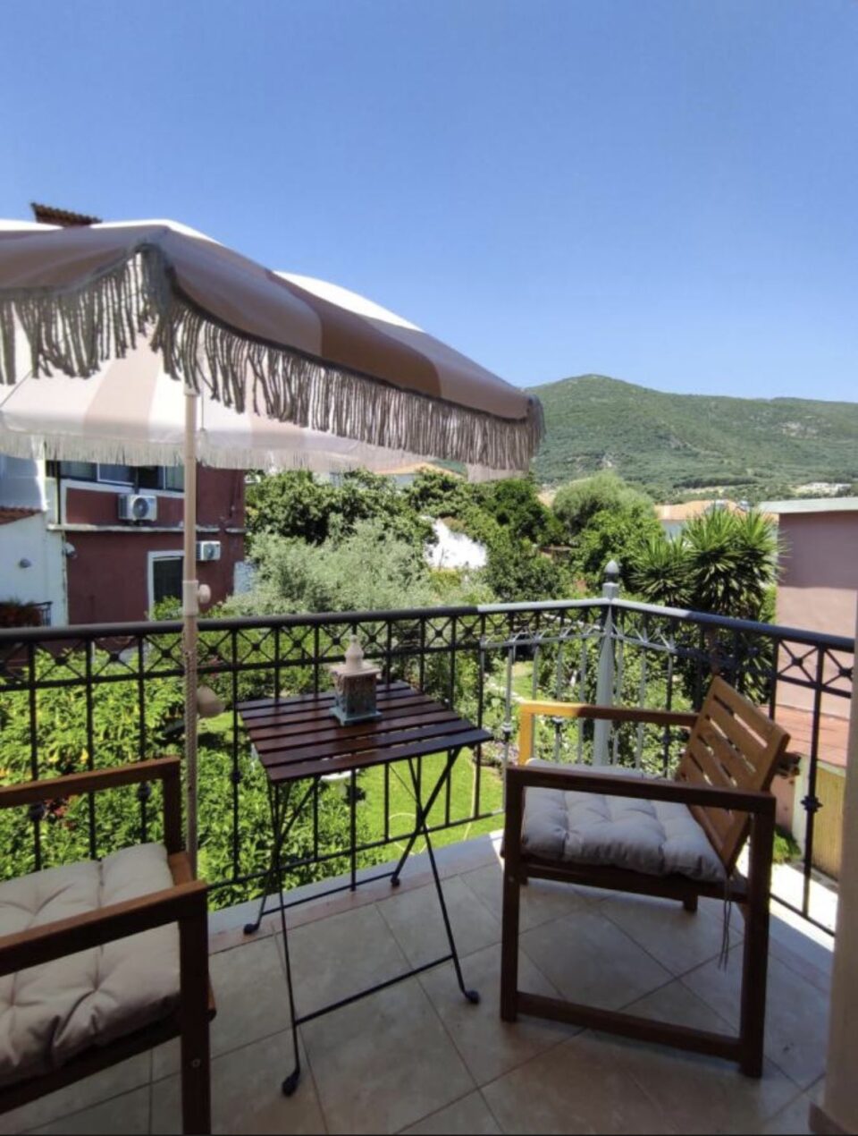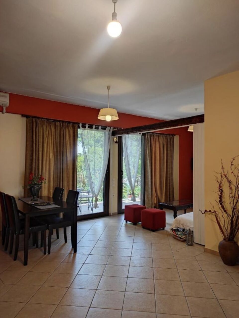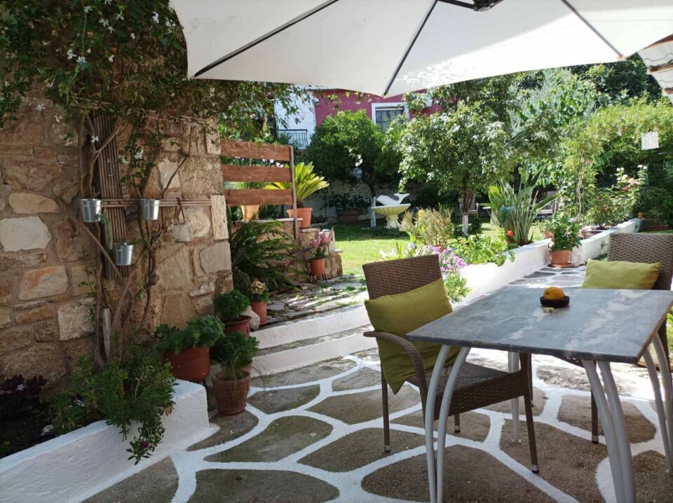 The big apartment ARCADE ( CAMARA in Greek ) is a luxurious apartment which consists of 65 square meters and can accommodate 4 persons. It is decorated with modern pieces of furniture and antiques of the last century which belong to the owner. The major materials which characterize this apartment are the stone and the wood. Pale colors dominate this big apartment which consists of a bedroom with an antique double bed , another separate bedroom with 2 single beds, separate sitting room with a fully equipped kitchen and a private bathroom. This apartment also has air-conditioning, Plasma television, Wi-Fi Internet ,safe box and a big veranda with direct access to the garden. The apartment is overlooking the garden( which is about 100 square meters) and a part of this garden is a common garden for the other guests.