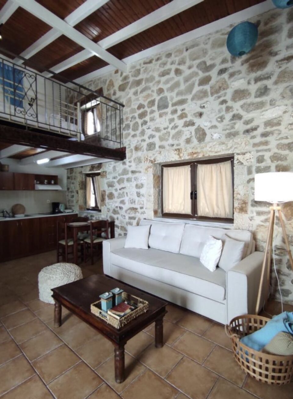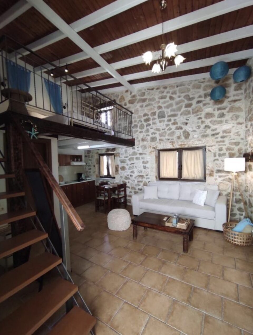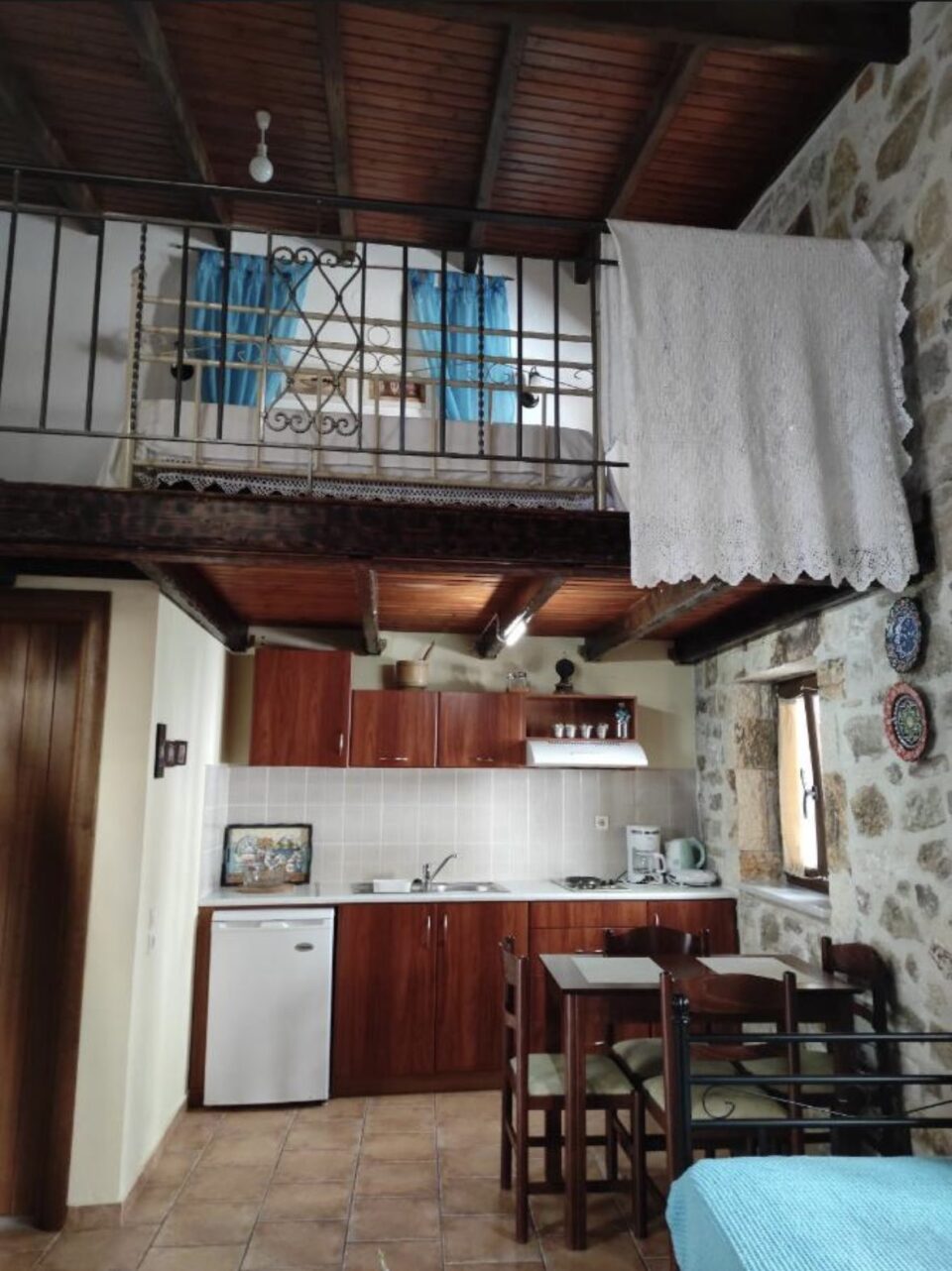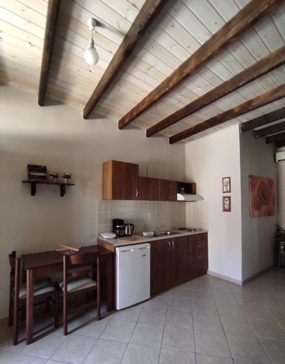 The MAISONETTE :The Ruin (HALASMA in Greek) is called like this because part of the wall was destroyed in the 18th century and for this reason the owners used this place to store oil , lime and to produce local soap. This Maisonnette style apartment(Up and Down) has been renovated according its original style of 18th century ,it is 52 square meters and is made of iron ,wood ,and stone. This Maisonnette can accommodate a family of 4 persons. The kitchen/sitting room is situated on the ground floor can sleep 2 persons (2 separate beds of a double sofa bed) and the bedroom which is situated upstairs in a wooden loft conversion can sleep also 2 persons ( one double bed).To go upstairs to the main bedroom from the kitchen there is a interior wooden staircase. The Maisonnette offer a fully equipped kitchen, a private bathroom, air-conditioning, Wi-Fi Internet safety box and Plasma television. There is also access to the gardens for the Guests of the Maisonnette style apartment.